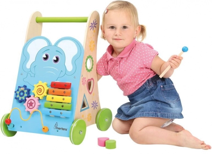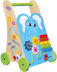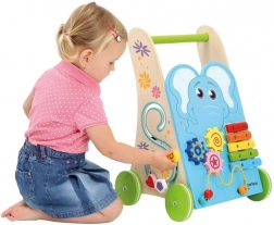 Het multifunctionele houten loopwagentje van Bino helpt kinderen zelfverzekerder te gaan staan en ontwikkelt tegelijk de fijne motoriek, oog-handcoördinatie en het gehoor. Dankzij de combinatie van activiteiten – xylofoon, vormenstoof, kralenlabyrint en tandwielmechanisme – is elk spel boeiend en leerzaam.
