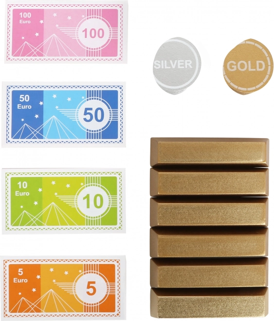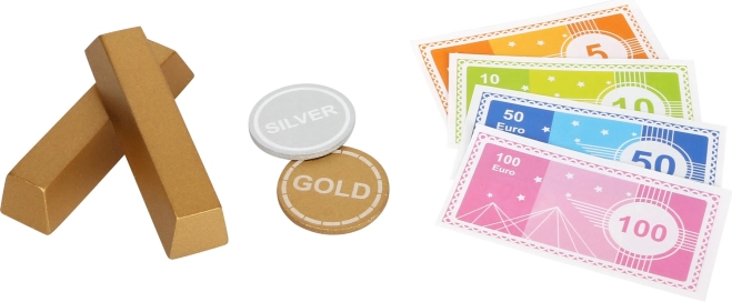 Bevat eurobankbiljetten, gouden en zilveren munten en houten goudstaafjes. Geweldig om de waarde van geld te leren, te rekenen en voor rollenspel als bankmedewerker en klant.