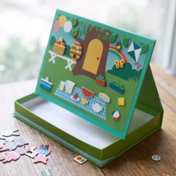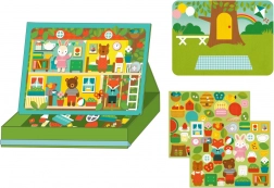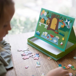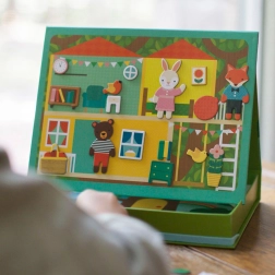 Het Magnetisch theater Dierenhuis Petit Collage biedt kinderen eindeloze mogelijkheden aan combinaties en scènes – van een knus dierenhuis tot een schattige picknick in het park. Dankzij de stops kan de magnetische scène eenvoudig worden neergezet, waardoor de doos in een handomdraai verandert in een praktisch theatertje.