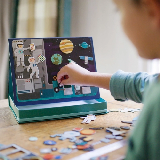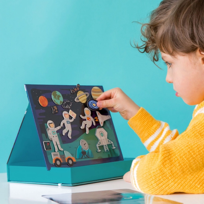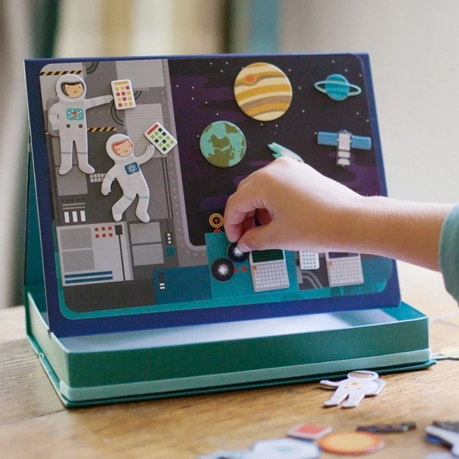 Het magnetische ruimtetheater biedt kinderen eindeloze combinatiemogelijkheden en scènes op twee magnetische achtergronden – in de ruimte en op een ruimtestation. Dankzij meer dan 50 magnetische onderdelen kunnen kleine ontdekkers originele verhalen creëren en hun fantasie en fijne motoriek ontwikkelen. De praktische doos met standaard en stopjes maakt het eenvoudig om overal een scène op te zetten.