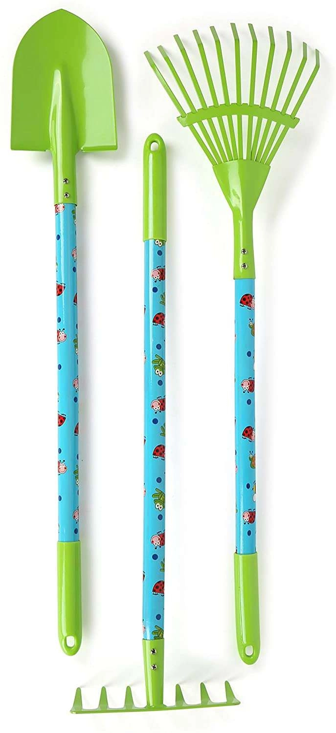 De lange gereedschappen zijn ongeveer 70 cm voor comfortabel harken en spitten, de kortere handgereedschappen meten ca. 15–20 cm. Dankzij de ergonomische handgrepen en het kinderformaat liggen de tools goed in de hand en ondersteunen ze goede gewoonten bij het werken in de tuin. De set motiveert kinderen tot actieve beweging, het leren van verantwoordelijkheid en gezamenlijke momenten met ouders.