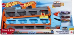 Met de race-transporter 2-in-1 van Hot Wheels kun je eenvoudig tot 20 autootjes opbergen en uitstallen dankzij de kleine raampjes in de trailer. Wanneer het tijd is om te racen, verandert de transporter na het uitklappen in een 1,8 meter lange racebaan. De voertuigen blijven zichtbaar onder de baan en de vrachtwagencabine verandert in een dubbele lanceerhelling voor twee auto’s.