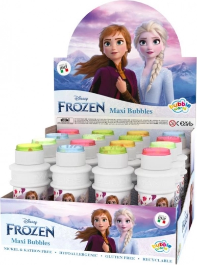 Maxi zeepbellen met een inhoud van 175 ml onder de FROZEN-licentie zorgen voor veel plezier. De stok met 3 ringen en de dop met een gekleurde bal en doolhof zullen elk kind verrassen. Het product is vrij van schadelijke stoffen en hypoallergeen, gemaakt in Italië.