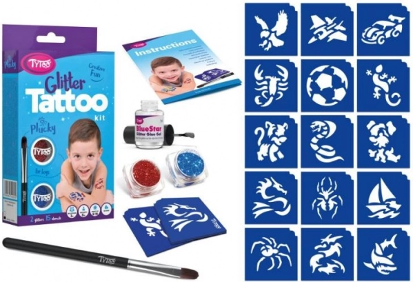 Ontdek creatieve pret voor kinderen met de glinsterende set TyToo Plucky. Bevat 15 jongensmotieven en 2 kleuren glitter voor het eenvoudig maken van tijdelijke tatoeages. Het motief blijft op de huid 8–18 dagen zitten, is waterbestendig en kan toch gemakkelijk worden verwijderd met alcohol of babyolie. Afgewerkte motieven kun je versieren met bewegende oogjes of zelfklevende steentjes.