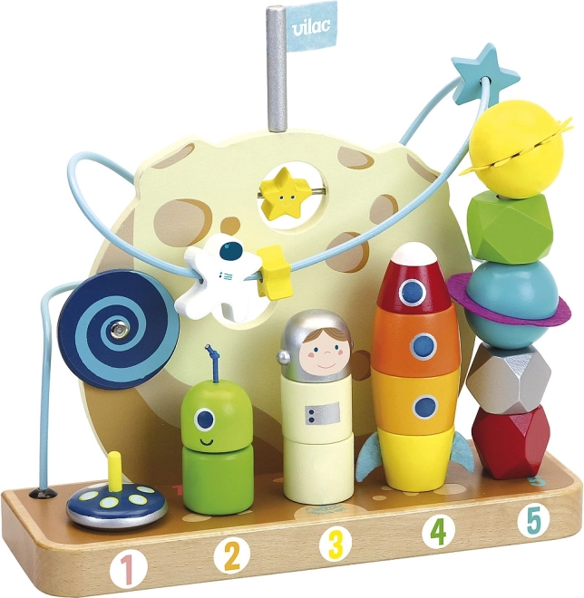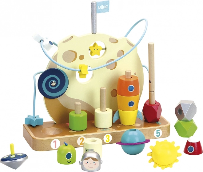 Dit sterrenhouten speelgoed van Vilac neemt kinderen mee naar een intergalactische wereld, waar ze planeten kunnen stapelen, tellen en sterren over een draad kunnen schuiven. Doordachte elementen stimuleren de ontwikkeling van de fijne motoriek, het logisch denken en het kleureninzicht.