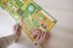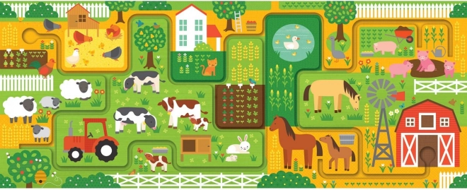 Ontdek de wereld van de boerderij met een creatief set dat puzzelen en een leuk zoekspel combineert. Na het leggen van de lange puzzel volgen kinderen de paadjes met hun vinger, trainen ze de oog-handcoördinatie en zoeken ze ondertussen 20 objecten op de afbeelding. Ideale activiteit voor samen met kinderen of voor zelfstandig spel.