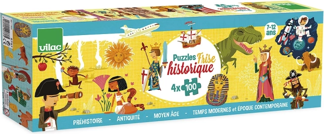 Ontdek de geschiedenis op een speelse manier met een collectie van vier grote houten puzzels die belangrijke gebeurtenissen van de prehistorie tot het heden laten zien. Elke puzzel heeft 100 stukjes en samen vormen ze na het leggen een lange tijdlijn. Ideaal voor kinderen vanaf 6 jaar die al spelend nieuwe kennis willen opdoen en hun logisch denken en fijne motoriek willen oefenen.