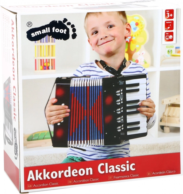 De kinderaccordeon small foot Classic brengt de vreugde van het ontdekken van klanken en ritmes naar de kinderkamer. De lichte kunststof behuizing, compacte afmetingen en comfortabele riemen maken het mogelijk om staand of zittend te spelen zonder onnodige belasting van de handen. De kleurrijke balgen en glanzende afwerking spreken direct aan.