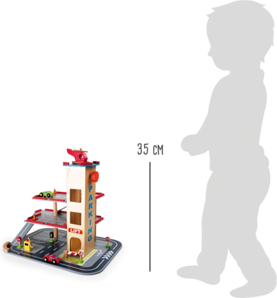 Dankzij het duurzame houten ontwerp is het speelgoed robuust en lang meegaand. De afmetingen van de parkeerplaats zijn 35x48x38 cm en zijn geschikt voor kinderen vanaf 3 jaar.
