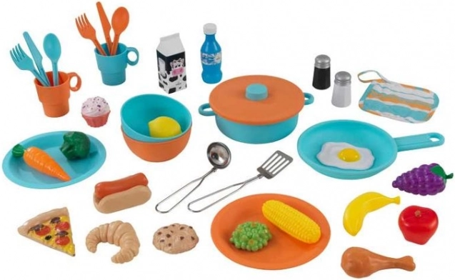 De set bevat 38 stuks servies, etenswaren en keukengerei. Kinderen kunnen meteen serveren, roeren, snijden en nieuwe receptjes ontdekken.