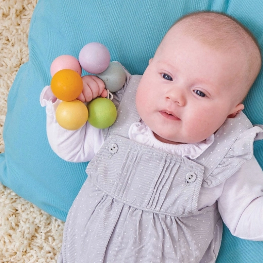 Pastelkleurige houten bolletjes aan een elastisch koord liggen prettig in de hand en helpen gevoelige tandvlees te verzachten tijdens het doorkomen van tandjes.