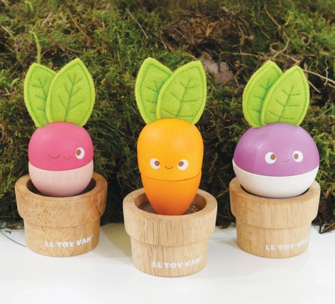 - 3 schattige groenten: wortel, radijs, biet – elk in een houten bloempotje
