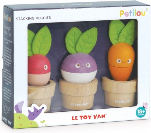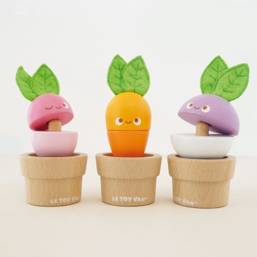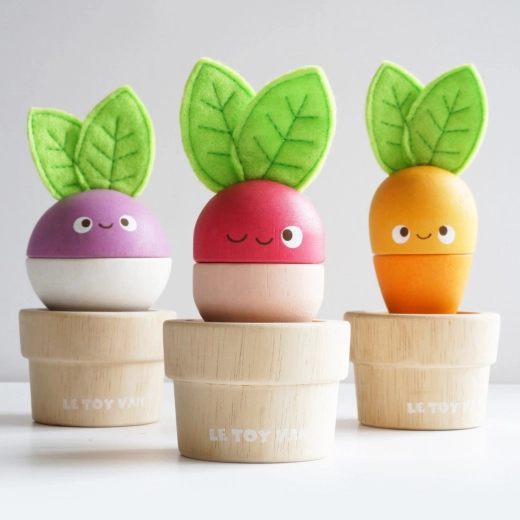 Een schattige set houten bloempotjes met groenten van LE TOY VAN stimuleert fijne motoriek, oog-handcoördinatie en verbeelding. Kinderen kunnen de afzonderlijke delen mixen en stapelen tot wortel, radijs en biet, of hun eigen combinaties maken. Het speelgoed is gemaakt van duurzaam hout, heeft vilten blaadjes en is met de hand bijgewerkt met niet-giftige verf op waterbasis.