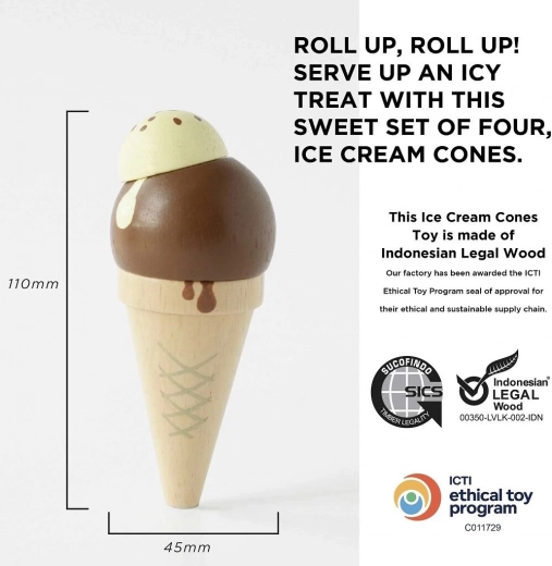 Spelen met ijsjes ontwikkelt op natuurlijke wijze creativiteit, sociale vaardigheden en communicatie. De stevige constructie van duurzaam hout en ethische productie garanderen duurzaamheid, zelfs bij dagelijks gebruik. Dankzij de realistische details worden kinderen uitgenodigd om te serveren, porties te tellen en eigen smaken te bedenken.