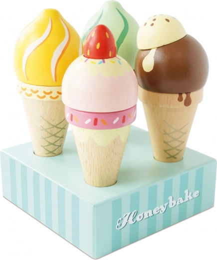De HONEYBAKE houten ijsset van Le Toy Van tovert elke kinderkamer om in een mini-ijssalon. Vier verschillend gedecoreerde bolletjes op natuurlijke hoorntjes zijn met de hand beschilderd met milieuvriendelijke verf op waterbasis en geplaatst op een stijlvolle standaard voor een overzichtelijke presentatie.