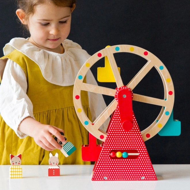 Geniet van uren speelplezier met het prachtig ontworpen houten reuzenrad van PETIT COLLAGE. Draai aan de slinger en kijk hoe het grote wiel ronddraait, drie schattige dierenvriendjes van beukenhout rondrijdt en tegelijk de fijne motoriek en coördinatie ontwikkelt. De robuuste constructie is geverfd met niet-giftige, op waterbasis gemaakte verf en past perfect in elke kinderkamer.