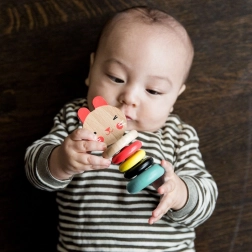 Geef je baby een veilige en zintuiglijk stimulerende speelgoedervaring. De houten rammelaar konijntje geeft bij zacht schudden een prettig tikgeluid, dat kalmeert en het gehoor stimuleert. Dankzij de compacte afmetingen ligt de rammelaar fijn in de hand en bevordert hij de fijne motoriek en de hand-oogcoördinatie.