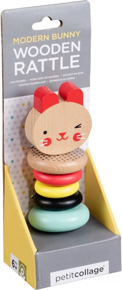 Schattige houten rammelaar in de vorm van een konijntje van het merk Petit Collage, die baby’s verblijdt met een zachte, rustgevende klank. Heeft vijf gladde beukenhouten ringen die ideaal zijn voor kleine handjes, levendige kleuren en patronen ter stimulatie van de zintuigen en is gemaakt van 100% FSC-gecertificeerd hout met niet-giftige, watergedragen verven.