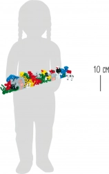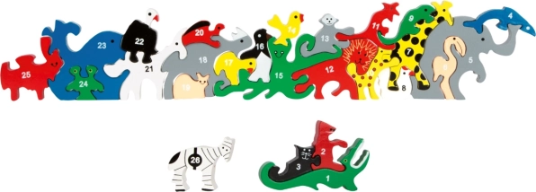 Het bestaat uit 26 stukjes, elk vertegenwoordigt een dier en is aan de ene kant gemarkeerd met een cijfer en aan de andere kant met een letter van het alfabet. Stimuleert fijne motoriek en bevordert creatief denken.