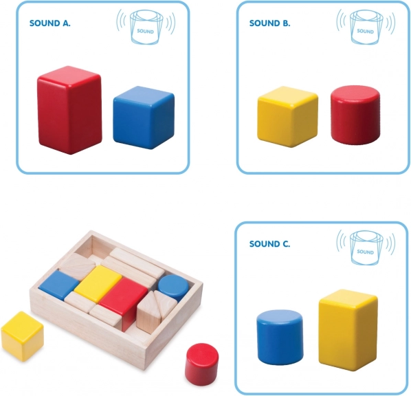Deze compacte en zorgvuldig afgewerkte bouwset combineert 6 gekleurde rammelblokjes en 7 natuurlijke blokken. Kinderen kunnen onderdelen vergelijken en matchen op basis van de intensiteit en het karakter van het geluid, en zo fijne motoriek en logisch denken trainen. Het doosje dient als slimme organizer en tegelijk als uitdaging – de blokken terugplaatsen vraagt om vindingrijkheid en ruimtelijk inzicht.