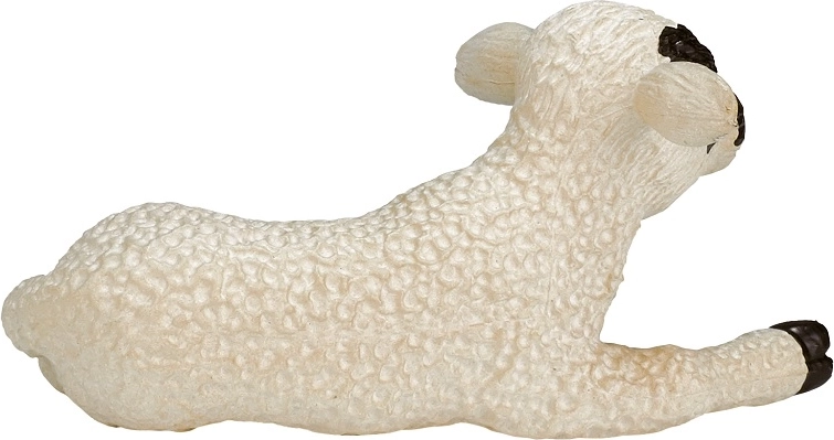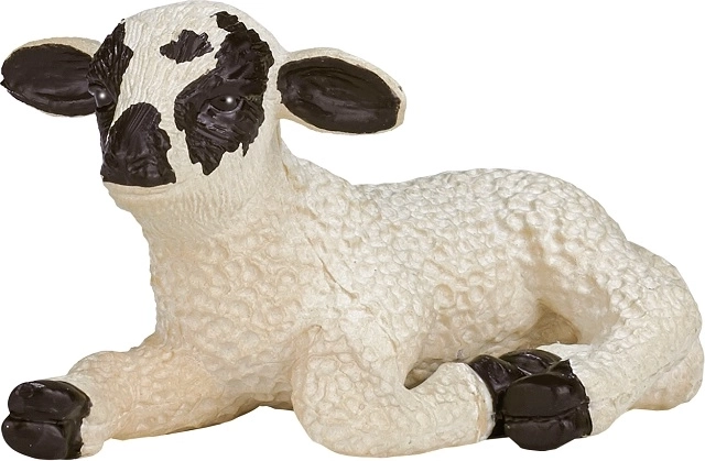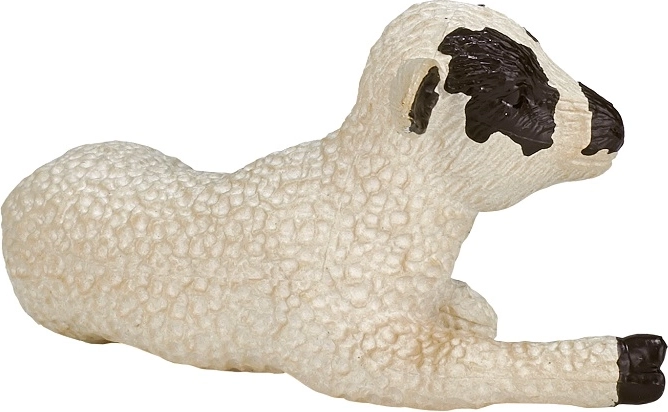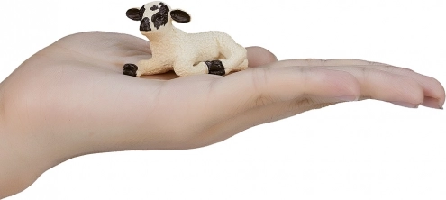 Dit kwalitatief afgewerkte figuur beeldt een Hampshire-lam in liggende positie natuurgetrouw uit. De realistische “wol”-textuur, contrasterende kleuring en precieze details stimuleren fantasie, thematisch spel en kennismaking met dieren.