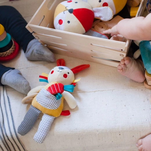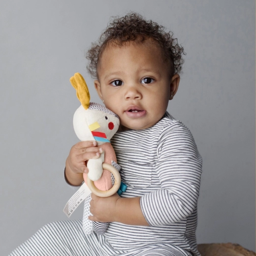 Het konijntje dient als rammelaar, bijtring en knuffel, waardoor het een zeer veelzijdig speeltje is.