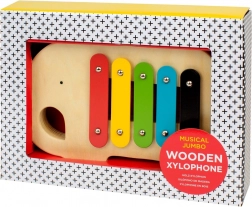 Vijf heldergekleurde metalen toetsen op een houten lichaam in de vorm van een olifant nodigen uit tot het ontdekken van tonen en de eerste speelervaringen. Inclusief houten stokje met elastische bevestiging.