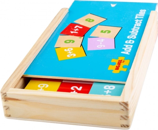 - Kleurrijke houten stukjes voor optellen en aftrekken met de cijfers 1–9, opgeborgen in een doosje