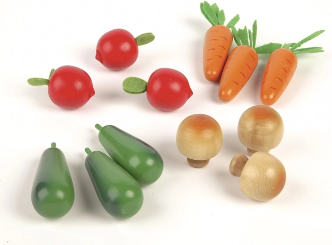 De set bevat een selectie favoriete groenten – wortel, courgette, tomaat en champignons – opgeborgen in een duurzame houten kist. Alles is zorgvuldig gemaakt van hoogwaardige en verantwoord verkregen materialen, veilig voor kinderspel.