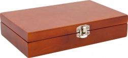 De stevige houten box met metalen sluiting beschermt kaarten en dobbelstenen. Past gemakkelijk in rugzak of koffer.