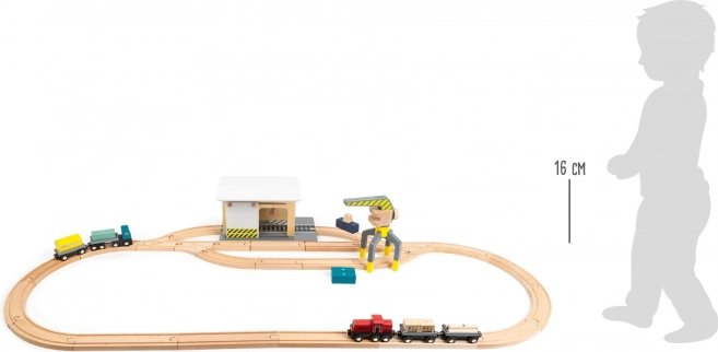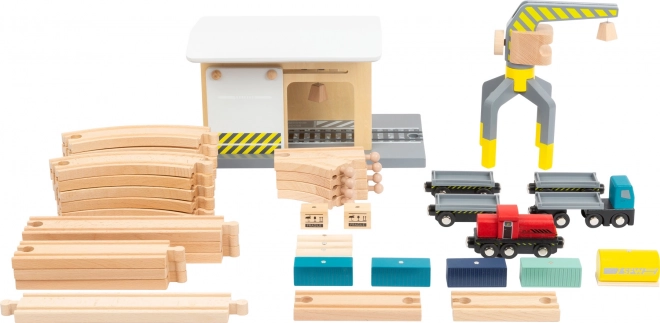 Ontdek een complete houten set voor een kleine spoorbaan, volledig compatibel met gangbare houten treinbanen. Kinderen beleven realistisch laden met de kraan, goederenvervoer en spel in het depot. De set bevat maar liefst 44 onderdelen, waaronder 25 railelementen, een 360° draaibare kraan, magnetische wagons en ladingen en een schuifwand met katrol. Gemaakt van 100% FSC-hout voor veilig en duurzaam speelplezier.