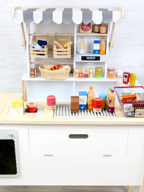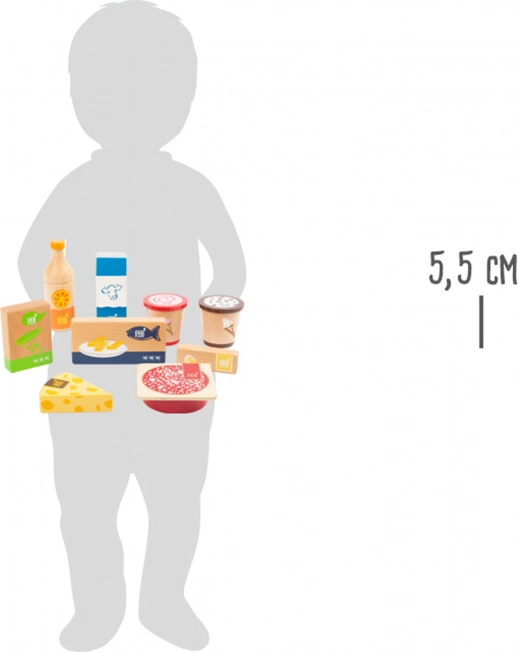 De set bevat sinaasappelsap, twee bakjes ijs, een verpakking doperwten, vissticks, boter, kaas, plakjes worst en een melkpak. Realistische prints en een natuurlijke look vallen meteen op. Dankzij het stevige hout is de set duurzaam en klaar voor dagelijks spelen.