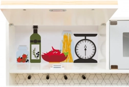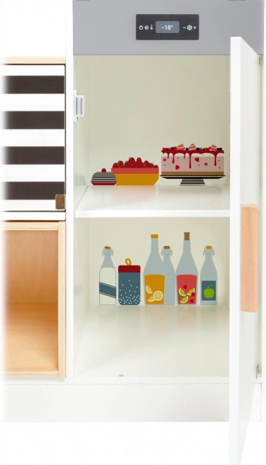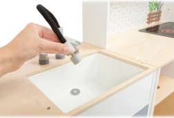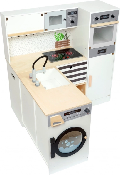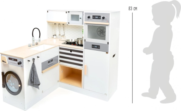 Deze modulaire houten keuken XL SMALL FOOT is ontworpen voor creatief en realistisch spel. Je kunt haar opbouwen als een hoekkeuken (L‑vorm) of als een rechte keuken met functioneel eiland, zodat ze eenvoudig aan ruimte en speelstijl wordt aangepast. Draaiknoppen met klikgeluid en een kookplaat met LED‑licht en geluid (2x AA‑batterijen, niet inbegrepen) zorgen voor een authentieke kookervaring.