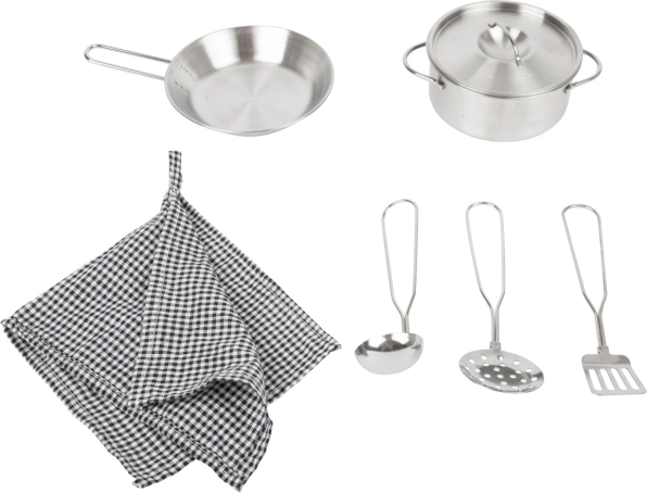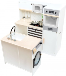 De keuken omvat een fornuis, oven, magnetron, koelkast en ruime opbergkastjes met deurtjes. Het eiland is uitgerust met een gootsteen, wasmachine en vaatwasser. In de set zit ook hoogwaardig metalen kookgerei voor direct speelplezier. Dankzij de robuuste materialen (hout, kunststof, metaal) is de keuken stabiel en duurzaam – ideaal voor dagelijks spelen door kinderen vanaf 3 jaar.