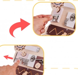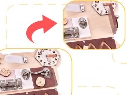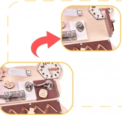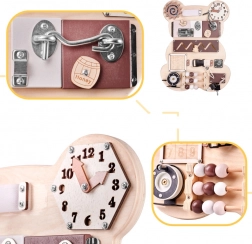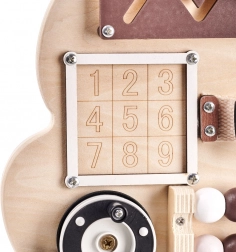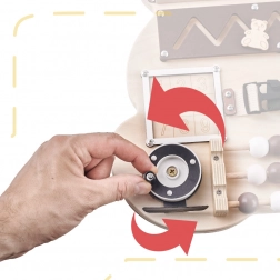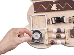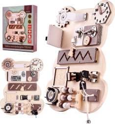 Om ervoor te zorgen dat het sensorisch bord de aandacht van het kind trekt en hem aanmoedigt om te spelen, heeft het bord de vorm van een schattige teddybeer en de gebruikte kleuren zijn aangenaam en aantrekkelijk voor het oog! Het bord bevat veel elementen, van de eenvoudigste activiteiten, zoals het bewegen van kralen op een telraam, tot de meer complexe, zoals het openen van een slot met een sleutel!