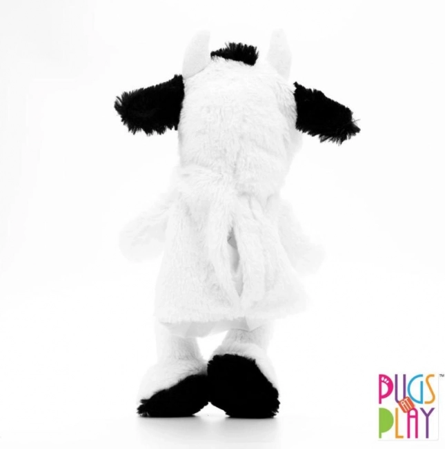 De schattige koe-handpop van het merk PUGS AT PLAY maakt alle kleine dierenliefhebbers blij. Dankzij de opening voor de hand bedien je eenvoudig de bewegingen en het geluid van de bek, waardoor de handpop een leuke zingende vriend wordt. Hij is gemaakt van zachte, aaibare pluche die prettig aanvoelt en stimuleert spelenderwijs de fijne motoriek, creativiteit en woordenschat. Hoogte ca. 32 cm (afmetingen ca. 14 × 14 × 32 cm). Batterijen 3× AG13 zijn inbegrepen en niet bedoeld om te vervangen. Onderhoud: handwas tot 30 °C.