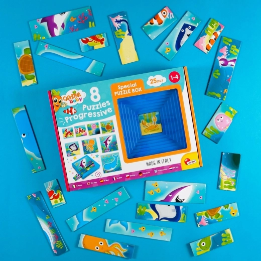 De progressieve puzzels CAROTINA Baby brengen kinderen spelplezier vanaf de allereerste stappen. Elk van de 8 puzzels heeft een verschillend aantal stukjes en verhoogt geleidelijk de moeilijkheid, zodat het kind vaardigheden op een natuurlijke manier ontwikkelt zonder frustratie. Thematische afbeeldingen uit de onderwaterwereld moedigen aan tot ontdekken en spelen.