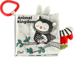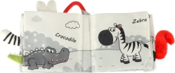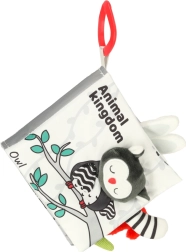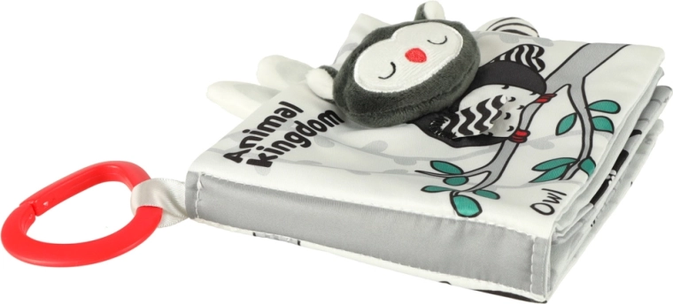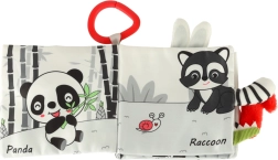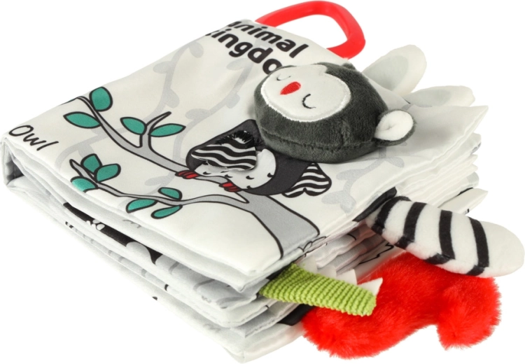 Met dit zachte boekje in contrasterende kleuren gaat je kindje op ontdekkingstocht in de dierenwereld – van uil via aapje en panda tot wasbeer, olifant, krokodil en zebra. Zwart-witte en rode elementen ondersteunen vroege visuele stimulatie, terwijl verschillende texturen en interactieve elementen de fijne motoriek en oog-handcoördinatie ontwikkelen. Elke pagina bevat Engelse dierennamen, wat op een natuurlijke manier de eerste woordenschat ondersteunt.