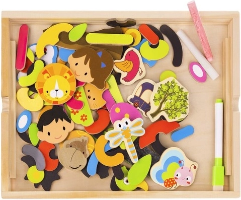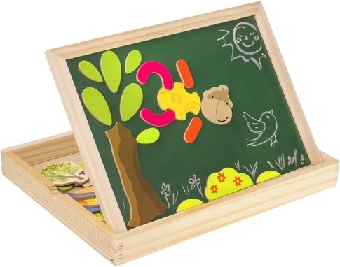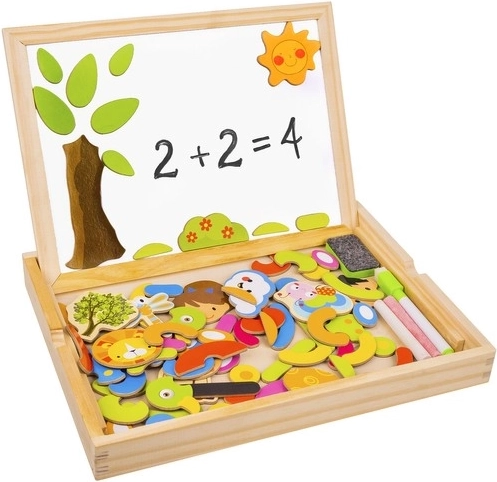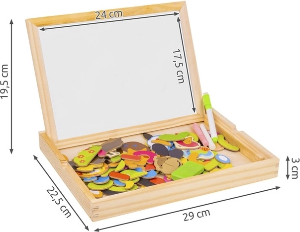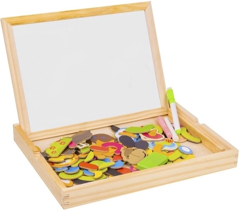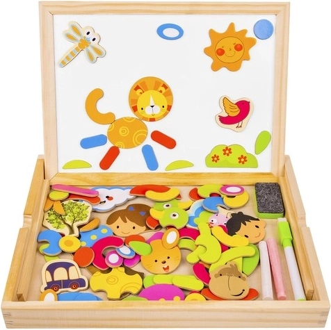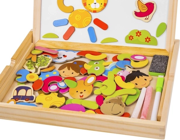 Breng uw kinderen urenlang plezier en creatief leren met dit houten magnetische bord! Het bord biedt twee zijden: zwart voor het tekenen met krijt en wit voor het schrijven met stiften of het rangschikken van magnetische afbeeldingen. Met het voorbeeldenboekje kunnen kinderen verschillende patronen en motieven creëren.