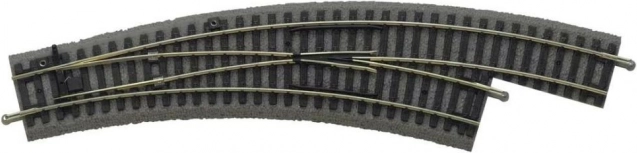 Wissel met gedetailleerde reproductie van houten dwarsliggers op grindbed in authentieke kleuren. Combineert een paar van 30° bogen, R3 en R2, gericht naar rechts en kan handmatig bediend worden.