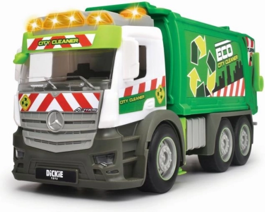 Ontdek stedelijk opruimen met de stijlvolle Mercedes vuilniswagen. Kinderen zullen de realistische afwerking met functionele lichten en geluiden geweldig vinden, die de spelbeleving versterken. De kiepbare laadbak en meegeleverde container maken het mogelijk om ‘afval’ te laden en te lossen zoals in het echt.
