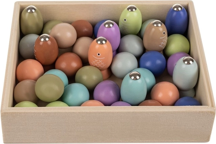 De plaat met een diameter van 22 cm is gemaakt van duurzaam hout en voorzien van een papieren onderlegger met oceaanthema. De rijke set onderdelen maakt verschillende spelvarianten mogelijk – van vissen vangen tot het verplaatsen van knikkers en zelfs tijdwedstrijden.