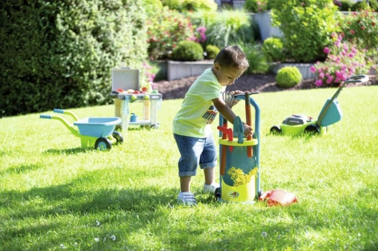 Dankzij de wielen en de handgreep vervoeren kinderen al het gereedschap gemakkelijk naar waar het nodig is – in de tuin, op de binnenplaats of op de speelplaats.