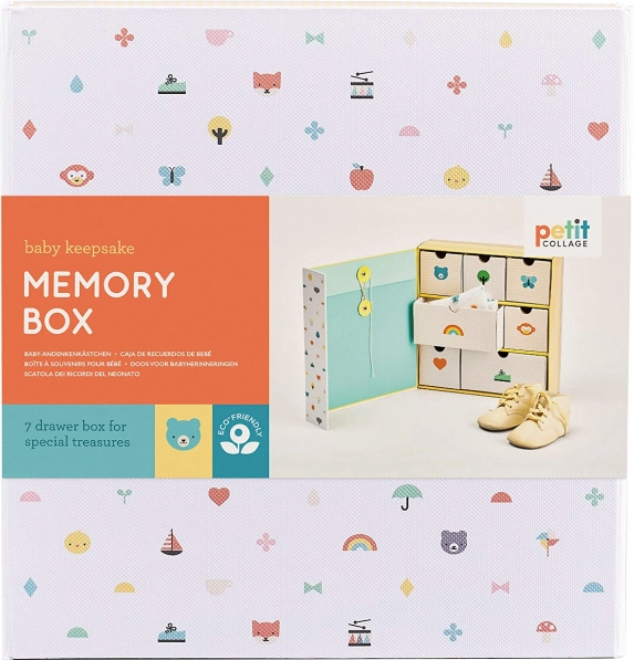 Deze elegante en doordachte herinneringenbox helpt alle kostbaarste momenten uit de eerste maanden en jaren van je kind te ordenen. Dankzij meerdere laden en een vak sorteer je kleine spulletjes eenvoudig en kun je er met plezier op elk moment op teruggrijpen. Het minimalistische, speelse design met illustraties maakt de box tot een mooie toevoeging aan de kinderkamer.