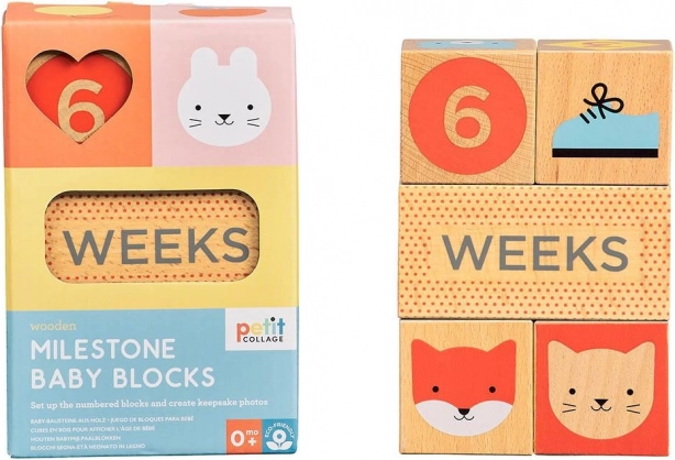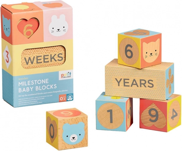 Stijlvolle mijlpaalblokjes van Petit Collage helpen je de belangrijkste momenten van je baby én zwangerschap vast te leggen. De set van FSC-gecertificeerd beukenhout biedt kleurrijke prints, cijfers en symbolen voor originele en overzichtelijke foto’s. Ideaal voor geboorte, de eerste maanden en jaren en voor zwangerschapsfoto’s.