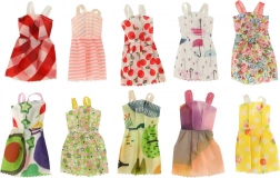De set bevat 10 rokken voor poppen met verschillende patronen zoals strepen, bloemen- en abstracte motieven.