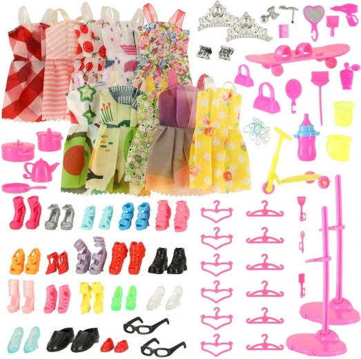 Deze megaset bevat in totaal 85 stuks, inclusief 10 kleurrijke rokken en vele andere aantrekkelijke accessoires, zoals schoenen of kroontjes. Daarnaast zijn er verschillende kleine standaarden en kleerhangers voor een gemakkelijke organisatie van de poppenkast.