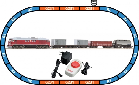 - Locomotief BR 130 ČSD (1×), goederenwagens (3×), boograils R2 met bedding 55412 (12×), rechte rails G231 met bedding 55401 (5×), rechte G231 met voedingsaansluiting 55406 (1×), beddingdeel voor klem 55447 (1×), voedingsklem 55270 (1×), analoge handregelaar met voeding 55003 (1×)