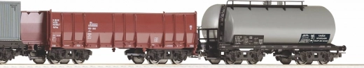 De set omvat container-draaistellenwagens, een open wagen en een ketelwagen voor authentieke gemengde lading en flexibele samenstellingen.