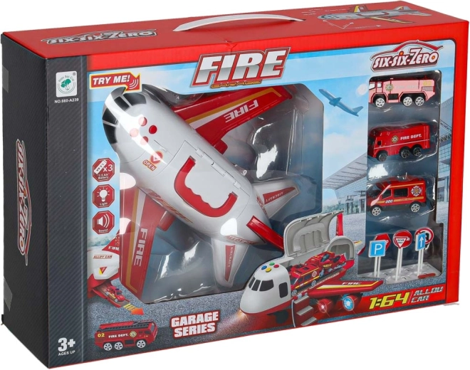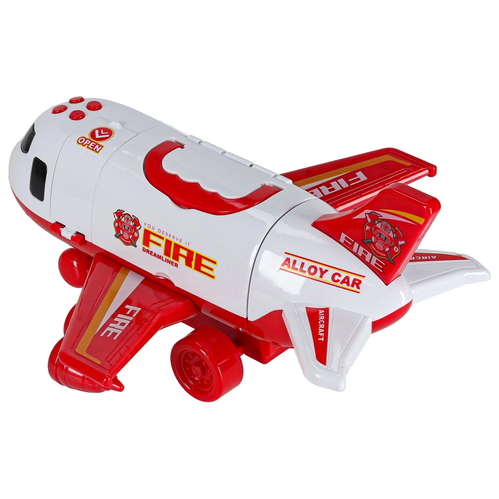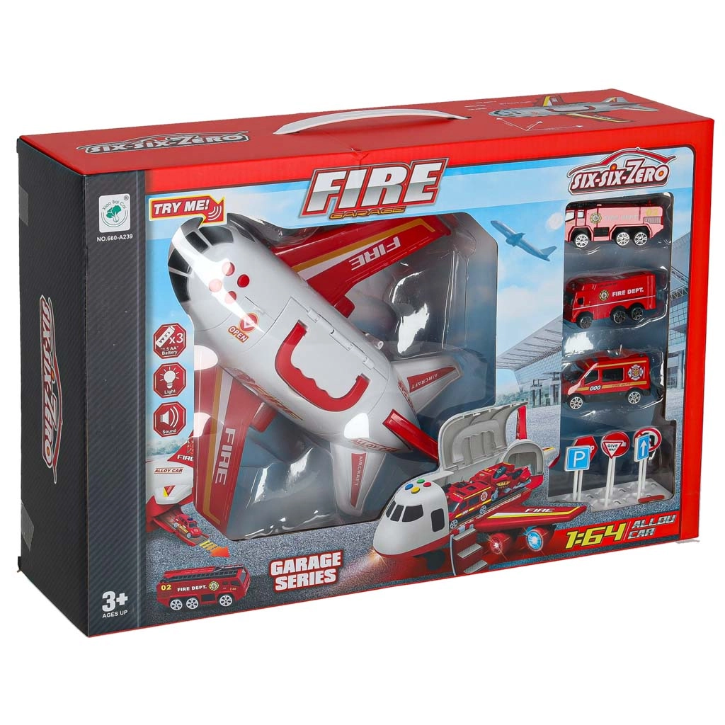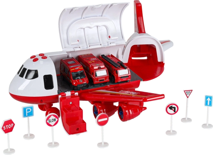Bevat 3 brandweerauto’s en een set van 7 verkeersborden. Alles past in het vliegtuig, dus netjes opgeruimd en klaar voor onderweg.